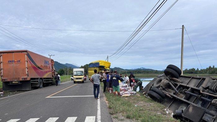 Pantauan wartawan, satu mobil truck bahkan terguling ke area persawahan di pinggir jalan.